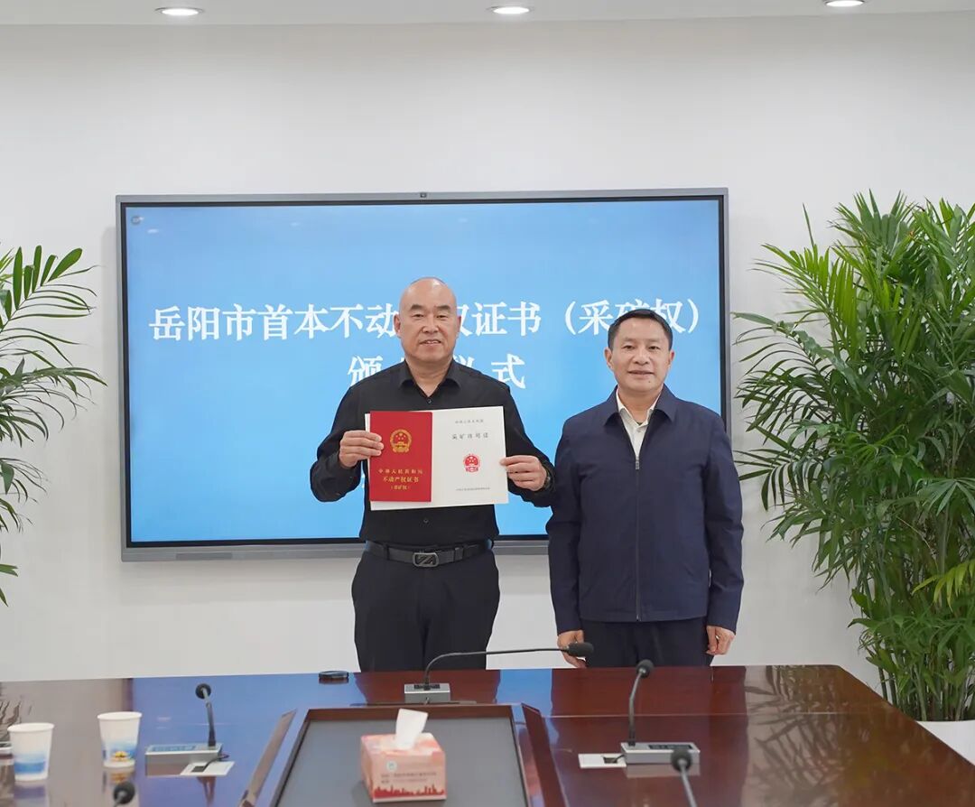 11月5日,岳阳市自然资源和规划局举行岳阳市首本不动产权证书(采矿权)颁发仪式,市自然资源规划局党组书记、局长许淞为岳阳市闽瑞石业有限公司颁发采矿权不动产权证书和采矿许可证书。