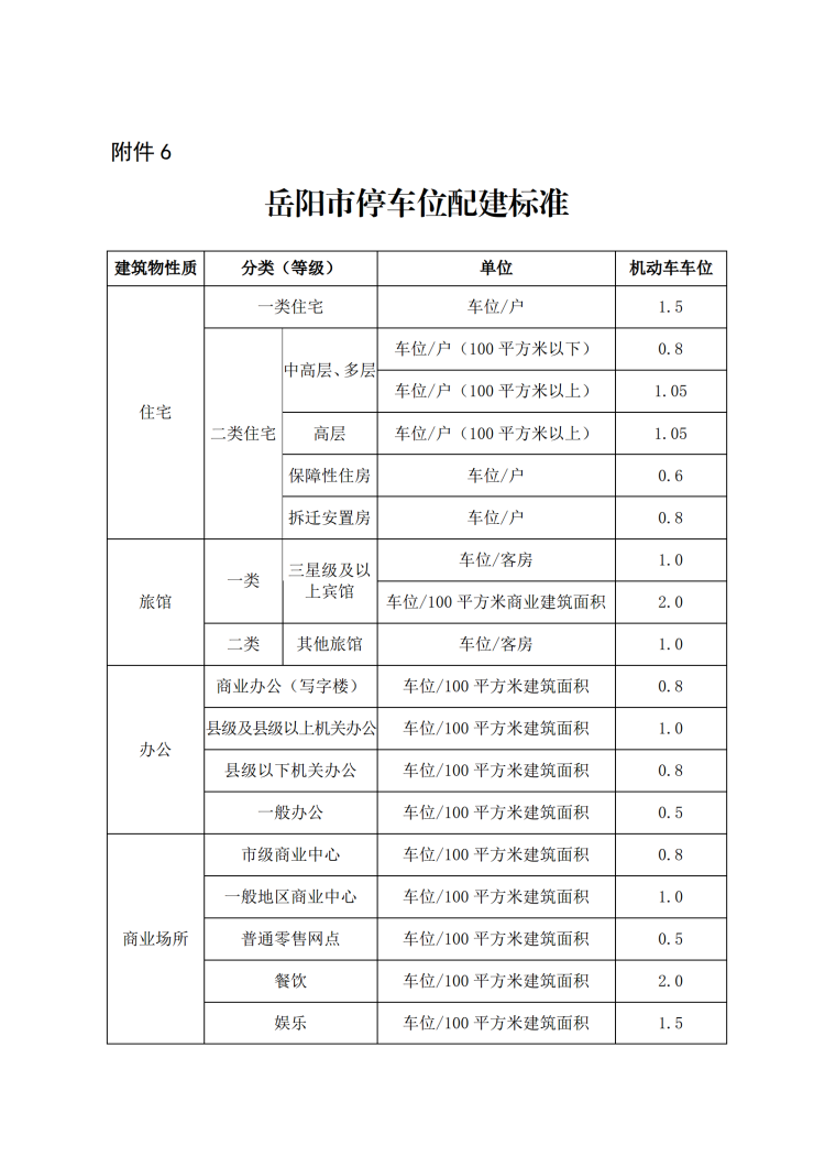 十九、市中心城区停车位的配建按照《岳阳市中心城区停车位配建标准》(见附件6)执行,表中未明确的事项或所列事项不明确的,由市资规局根据具体情况核定停车位配建标准。改(扩)建建筑物总面积大于或等于500平方米的,除增加建筑面积的部分应按要求配建停车位外,按原建筑物面积配建停车位不足的,应在改(扩)建的同时,按不低于车位差额数的30%予以补建。学校及医院应设置即走即停车辆临时停靠点。