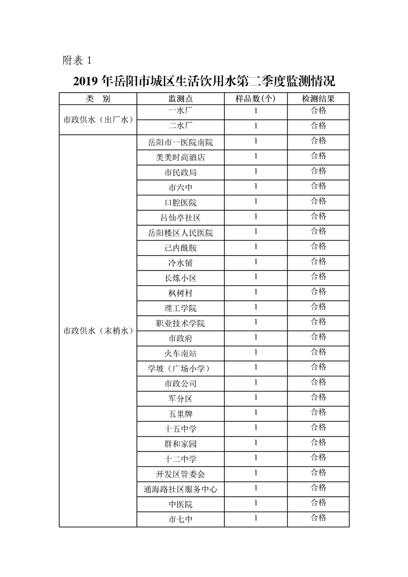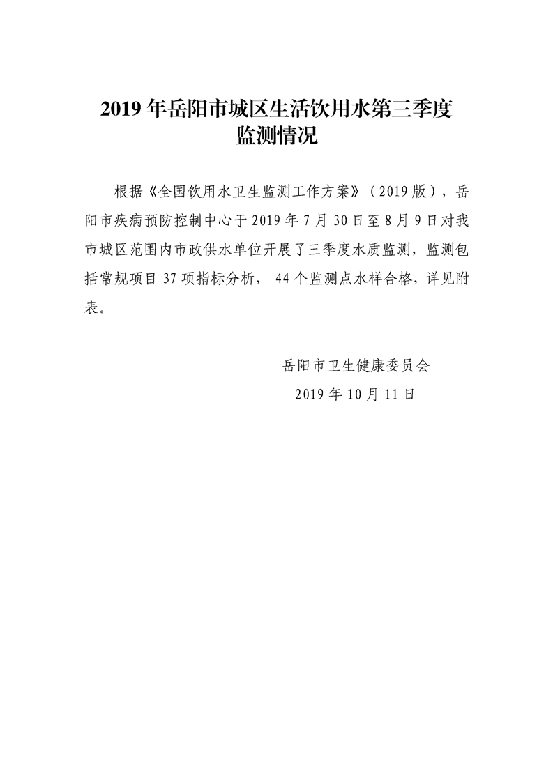 岳阳市城区生活饮用水2019年第三季度监测情况