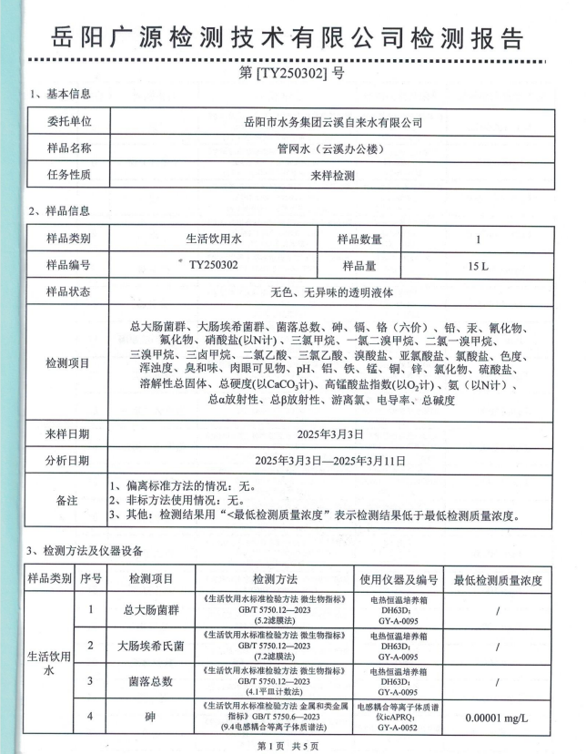 2025年3月岳阳市水务集团管网水水质检测月报表
