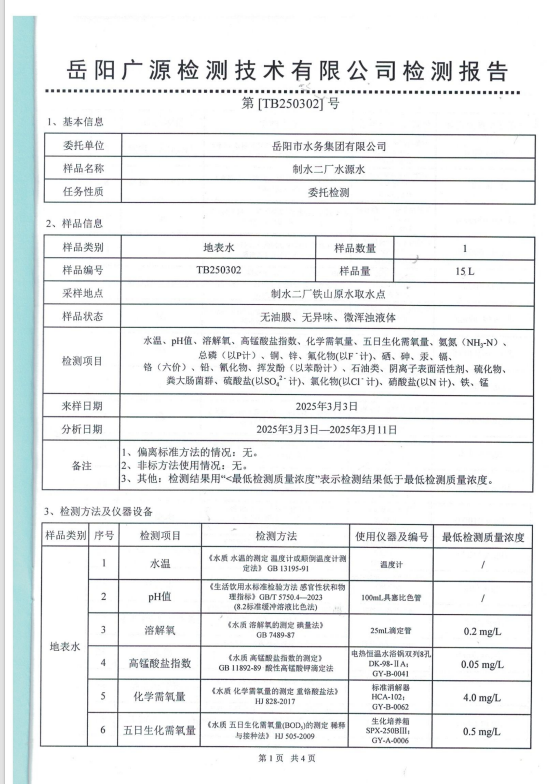 2025年3月岳阳市水务集团水源水水质检测月报表
