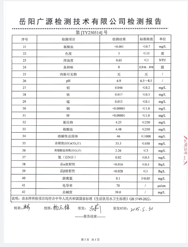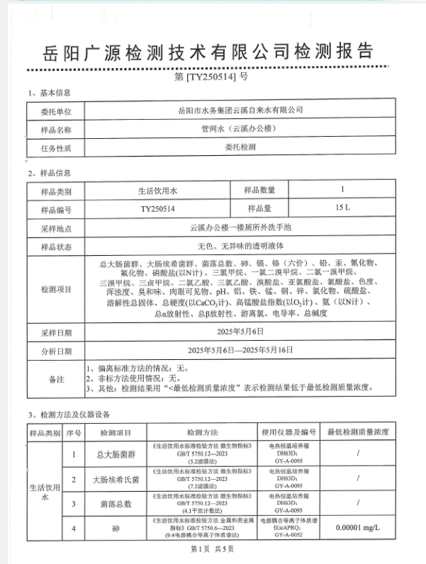 2025年5月岳阳市水务集团管网水水质检测月报表