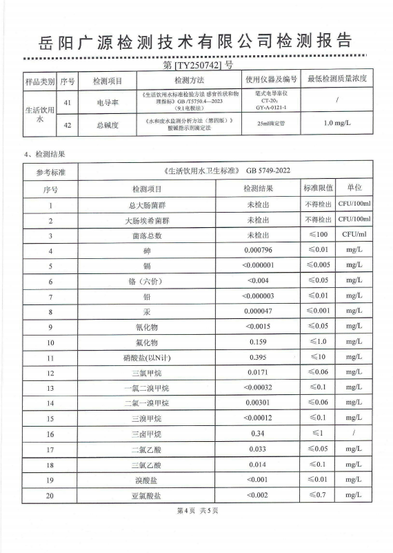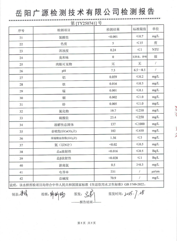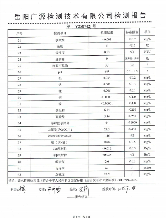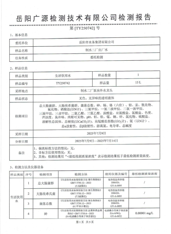 2025年7月岳阳市水务集团出厂水水质检测月报表