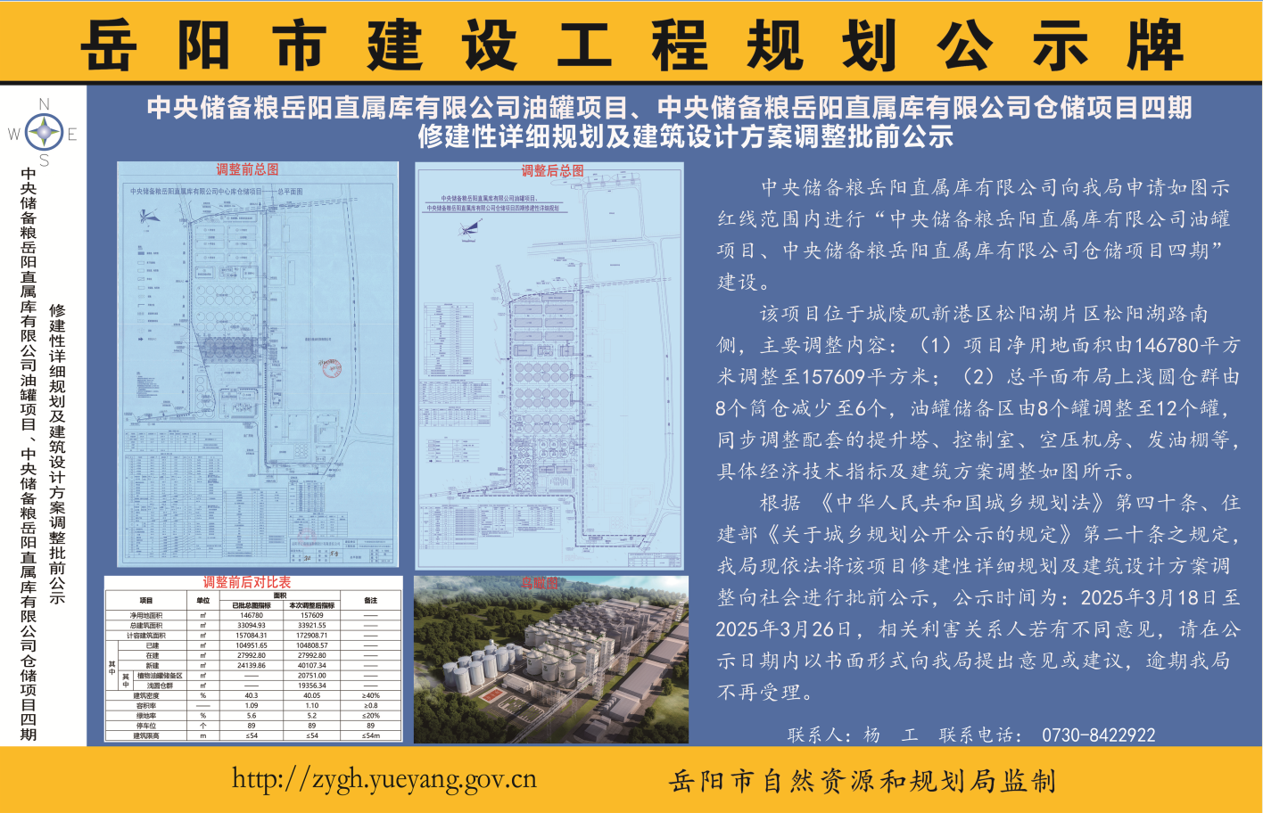 中央储备粮岳阳直属库有限公司油罐项目、中央储备粮岳阳直属库有限公司仓储项目四期修建性详细规划及建筑设计方案调整批前公示