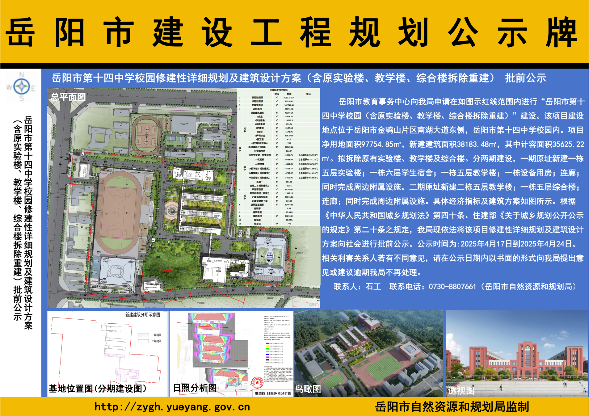 岳阳市第十四中学校园修建性详细规划及建筑设计方案(含原实验楼、教学楼、综合楼拆除重建)批前公示