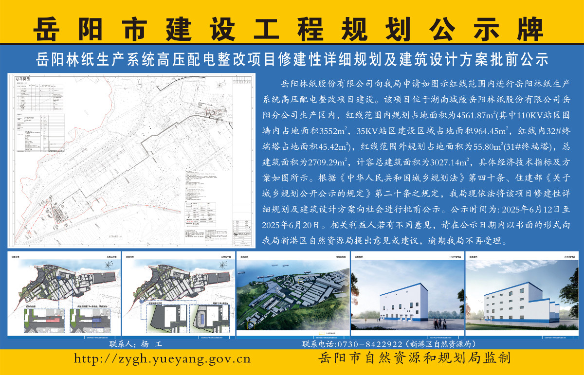 岳阳林纸生产系统高压配电整改项目修建性详细规划及建筑设计方案批前公示