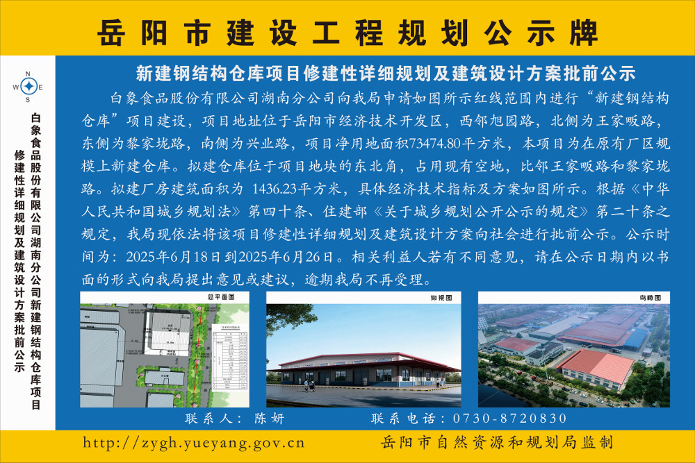 白象食品股份有限公司湖南分公司新建钢结构仓库项目修建性详细规划及建筑设计方案批前公示
