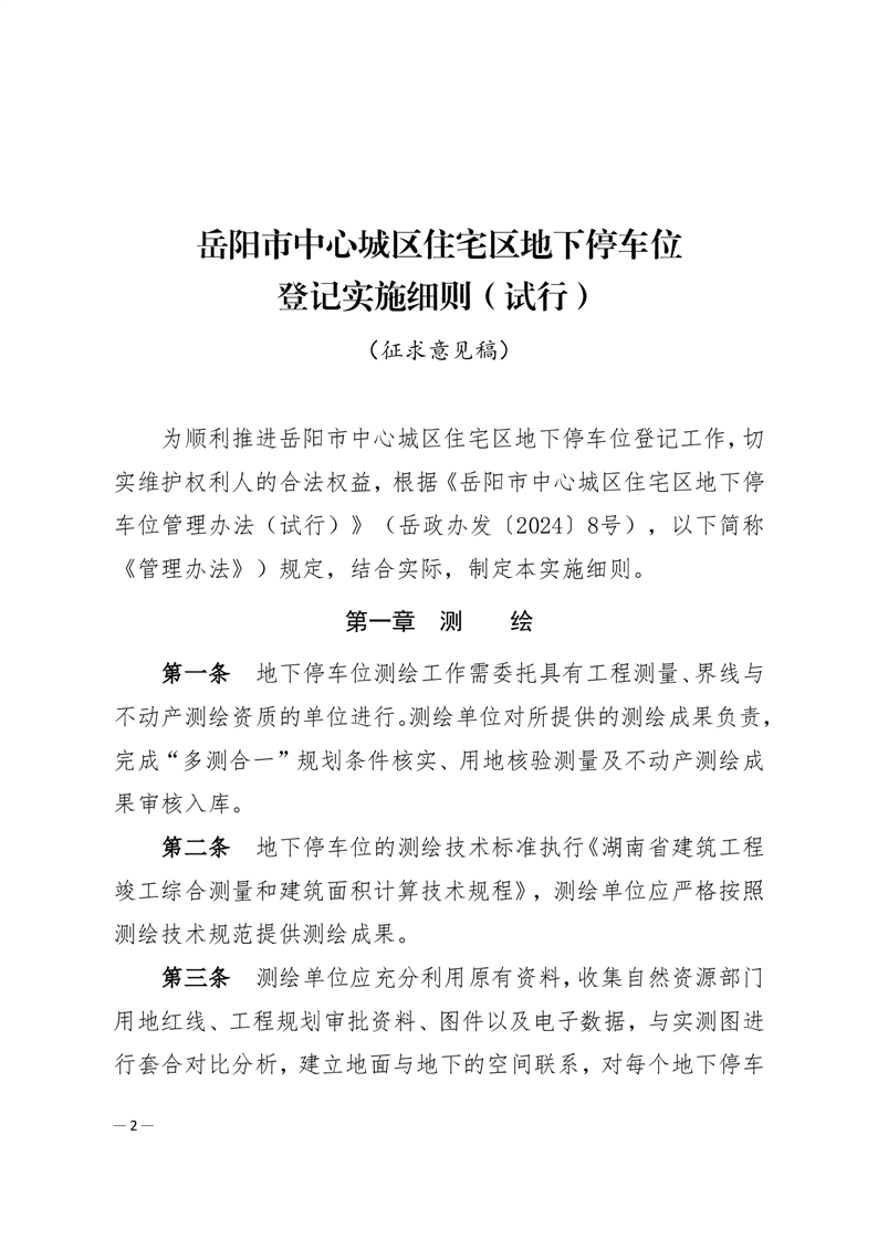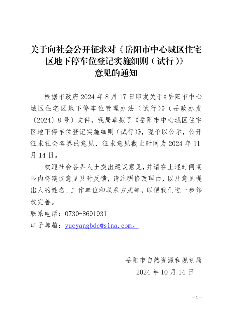 关于向社会公开征求对《岳阳市中心城区住宅区地下停车位登记实施细则(试行)》 意见的通知
