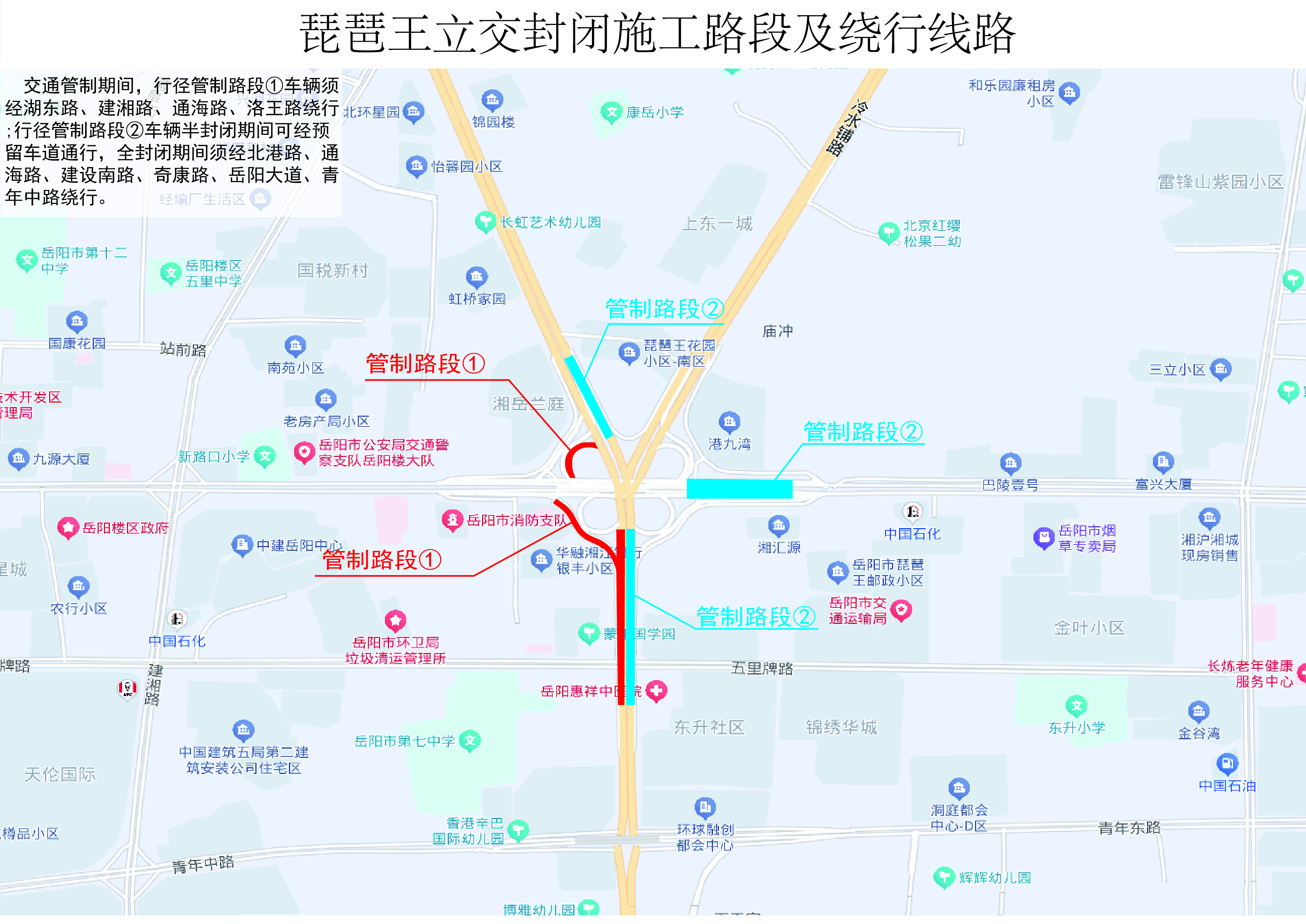 交通管制期间,行径管制路段①车辆须经湖东路、建湘路、通海路、洛王路绕行;行径管制路段②车辆半封闭期间可经预留车道通行,全封闭期间须经北港路、通海路、建设南路、奇康路、岳阳大道、青年中路绕行。