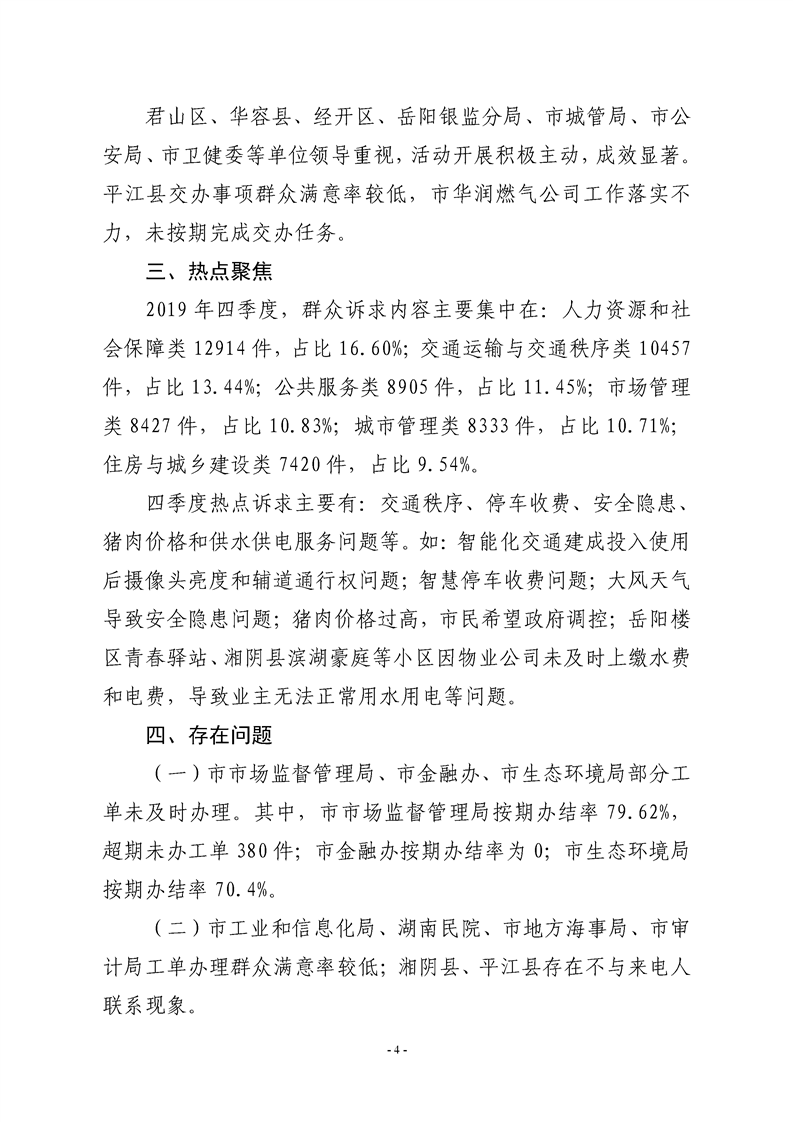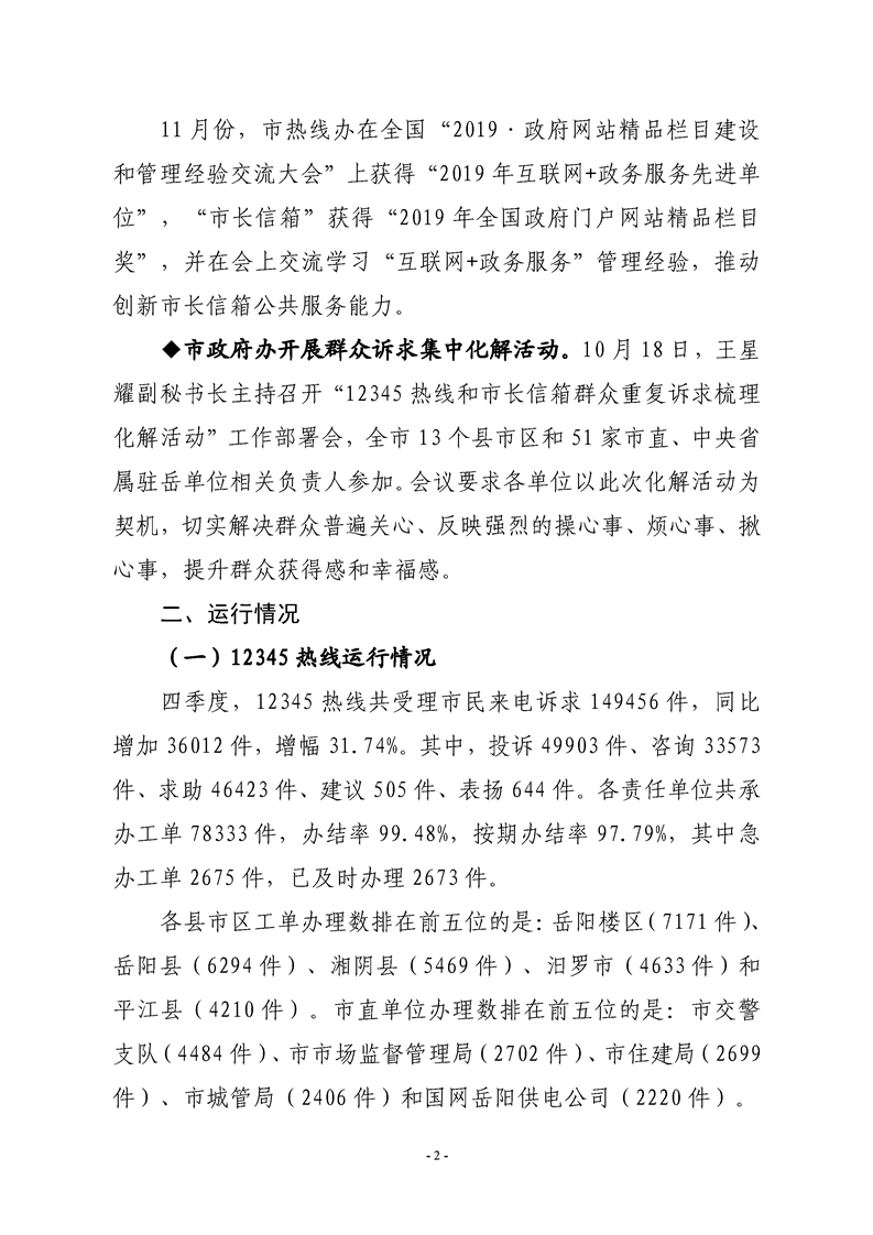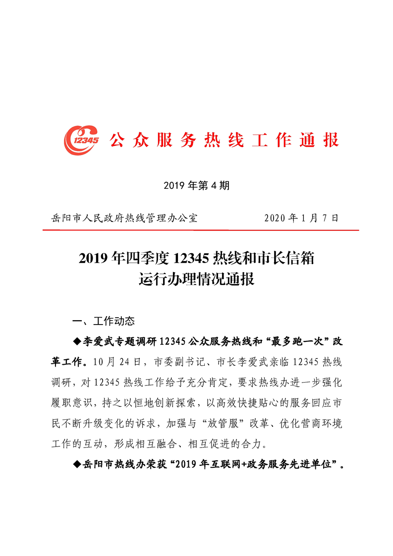 2019年四季度12345热线和市长信箱运行办理情况通报