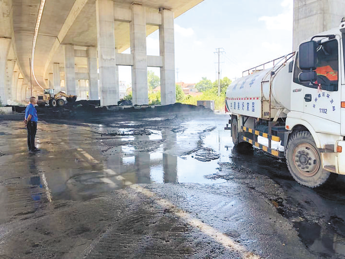 收到热线单后,职能部门立即安排城管环卫工作站、滨湖村、渔场工作人员到现场察看,对周边住户上门走访,排查煤灰来源,并且在相关区域内显眼处张贴告示,无奈一直无人认领。这黑压压的一片严重影响周边居民的生活,工作组当机立断,要将这老百姓心头之患的煤灰全部转移。7月31日,城管环卫工作站、滨湖村、渔场会同岳阳东高速路政、君山高速路政巡警支队,在区环境卫生管理中心协助下,对长期违规放置的煤灰堆场进行依法强制处理,并申请调配洒水车清洗路面7小时,终于路面由“黑”转“白”,还了老百姓一片净土。