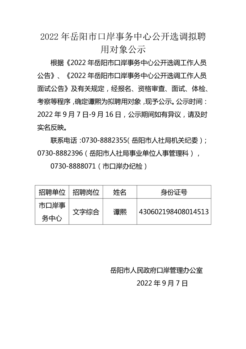 2022年岳阳市口岸事务中心公开选调拟聘用对象公示