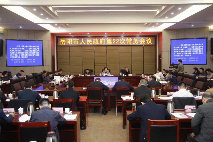 昨天上午,市长李爱武主持召开市政府第22次常务会议,传达学习省委副书记、省长许达哲来岳考察讲话精神,审议《岳阳市城乡污水处理收费改革试点实施方案(审议稿)》《岳阳市工业地产管理办法(审议稿)》《关于第三批清理规范16项政府部门行政审批及其他职权中介服务事项的决定(审议稿)》《岳阳市集体土地征收与房屋拆迁补偿安置办法(审议稿)》,听取教育体育工作情况汇报,传达全省扫黑除恶专项斗争推进会及《关于禁止利用领导干部职权或者职务上的影响“提篮子”谋取私利的规定》文件精神,听取“一村一辅警”“城市快警”建设工作情况汇报,安排部署当前工作等。