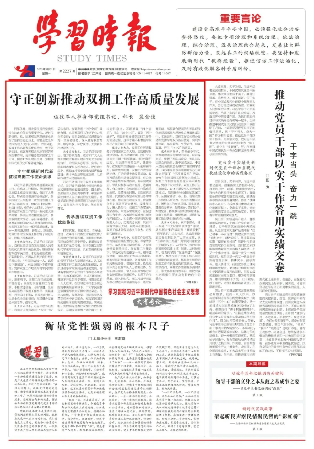 《学习时报》2025年3月31日第1版发表退役军人事务部党组书记、部长裴金佳署名文章《守正创新推动双拥工作高质量发展》,全文如下——