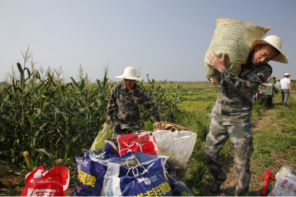 在热浪滚滚的田地里,志愿者们顶着太阳,大汗淋漓,大颗大颗的汗珠从头顶掉往脚下,许多志愿者头脸被蚊虫咬起了红疙瘩,手腕被玉米叶子划起了小口子,大家都不在乎,只顾一个劲地掰玉米、扛玉米、挑玉米,经过一天的紧张奋战,终于把8亩多玉米,12吨玉米全部收回了家。