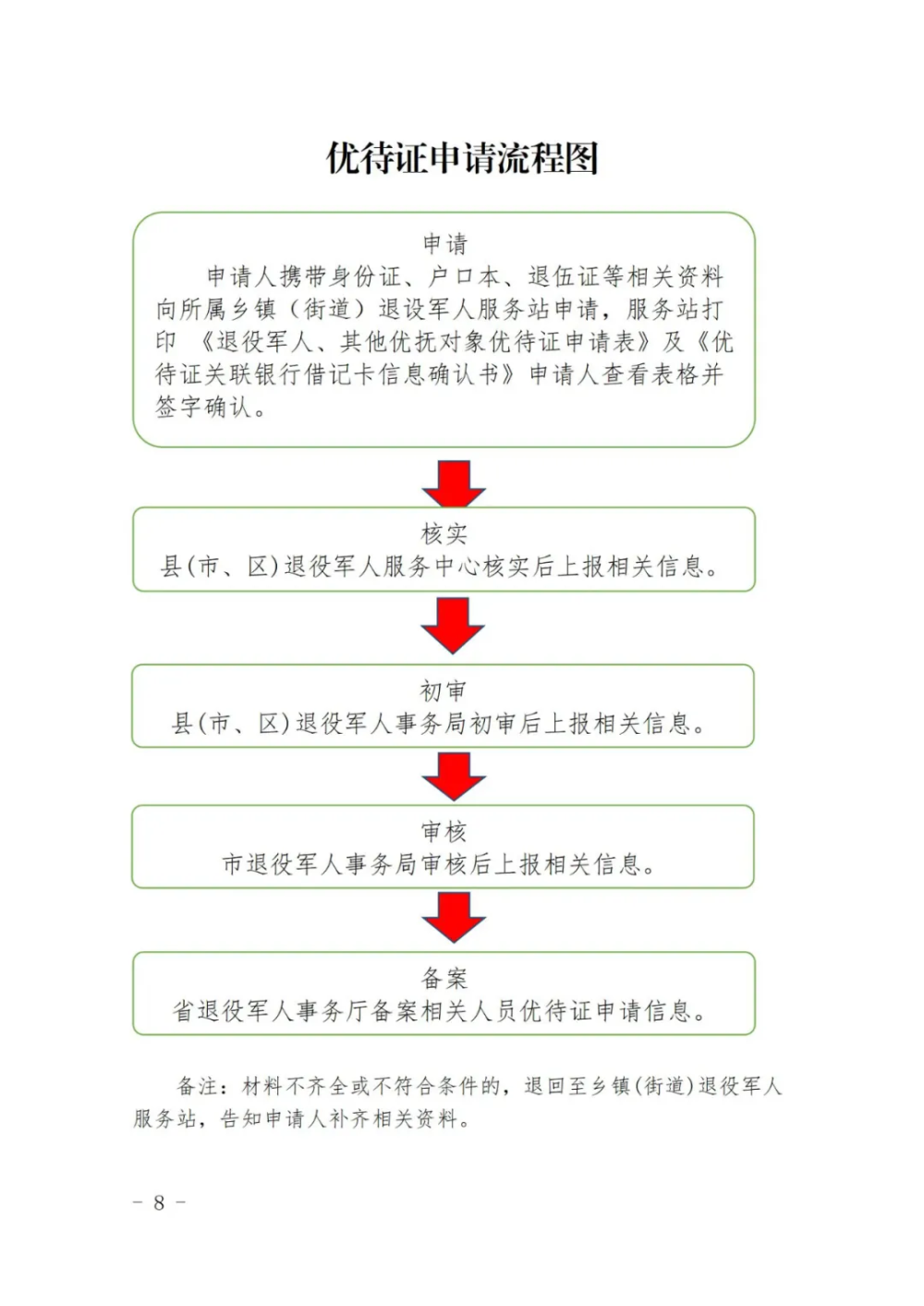 (四)优待证申请受理后,系统提交县、市、省退役军人事务部门和合作银行审核通过后,由相应银行制卡工厂制作《优待证》。