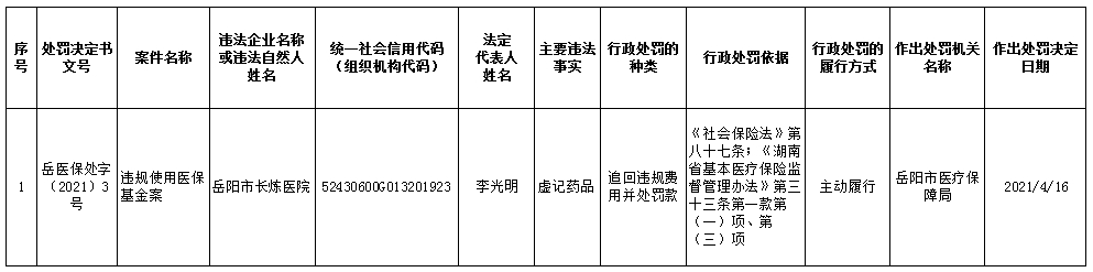 2021年岳阳市医疗保障局行政处罚信息公示