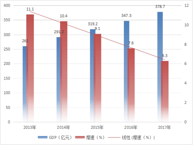 初步核算,全年完成地区生产总值378.7亿元,比上年增长6.3%。其中,第一产业实现增加值43.6亿元,增长4.2%;第二产业实现增加值210.8亿元,增长5.0%;第三产业实现增加值124.3亿元,增长9.6%。三次产业结构比为11.5:55.7:32.8。按常住人口计算,人均地区生产总值 59985元,增长8.6%。