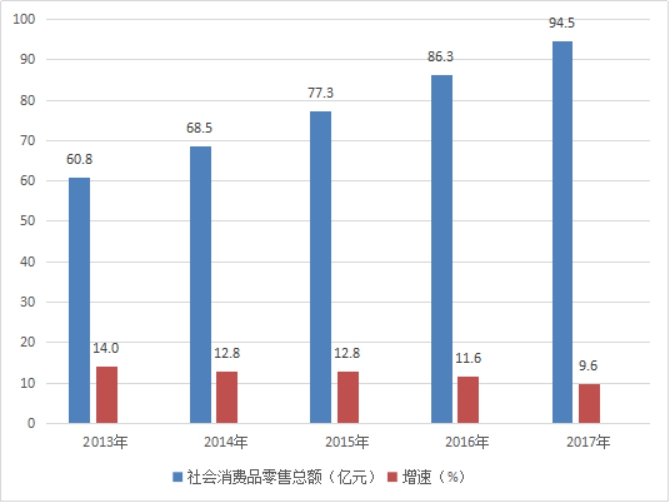 全年实现社会消费品零售总额94.5亿元,比上年增长9.6%。从经营地看,城镇消费品零售总额73.7亿元,增长6.9%;乡村消费品零售总额20.8亿元,增长19.5%。从消费类型看,商品零售额90.9亿元,增长9.6%;餐饮收入3.6亿元,增长9.0%。限额以上法人批发和零售业商品零售额45.7亿元,比上年下降15.2%。从商品类别看,粮油、食品类下降29.4%,家用电器和音像器材类增长20.9%,饮料类增长4.5%,烟酒类增长33.5%,服装、鞋帽类下降27.1%,化妆品类增长25.6%,日用品类增长1.2%,汽车类下降4.7%。