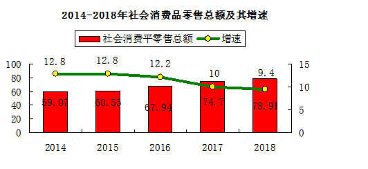 全年实现社会消费品零售总额78.91亿元,同比增长9.4%。按城乡分,城镇消费品零售额59.84亿元,同比增长9.2%;乡村消费品零售额19.07亿元,同比增长9.6%。按行业分,批发业零售额4.15亿元,增长9.1%;零售业零售额62.14亿元,增长9.4%;住宿业零售额5.46亿元,增长9.2%;餐饮业零售额7.16亿元,增长9.7%。