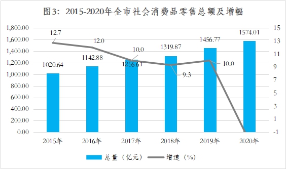 全年全市实现社会消费品零售总额1574.01亿元,比上年下降2.3%。按经营地分,城镇消费品零售额1360.01亿元,下降2.5%;乡村消费品零售额214亿元,下降1.0%。