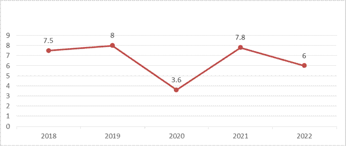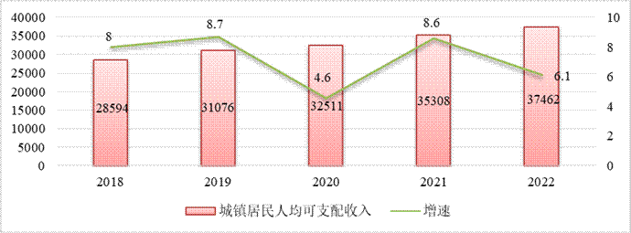 图6 2018-2022年城镇居民人均可支配收入及增速