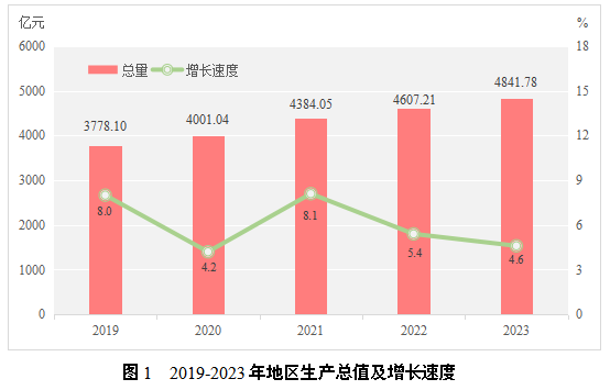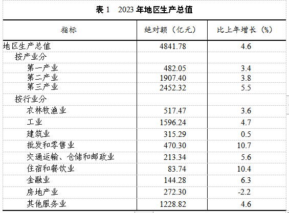 根据地区生产总值统一核算结果,全年地区生产总值4841.78亿元,比上年增长4.6%。其中:第一产业增加值482.05亿元,增长3.4%;第二产业增加值1907.40亿元,增长3.8%;第三产业增加值2452.32亿元,增长5.5%。按常住人口计算,人均地区生产总值96749元,增长5.1%。