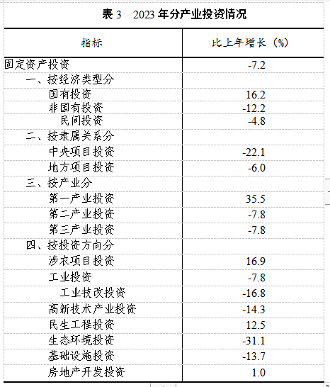 全市固定资产投资比上年下降7.2%。分产业看,第一产业投资增长35.5%;第二产业投资下降7.8%;第三产业投资下降7.8%。分经济类型看,国有投资增长16.2%;非国有投资下降12.2%,民间投资下降4.8%。分投资方向看,工业投资下降7.8%;民生工程投资增长12.5%;生态环境投资下降31.1%;基础设施投资下降13.7%;高新技术产业投资下降14.3%;工业技改投资下降16.8%。