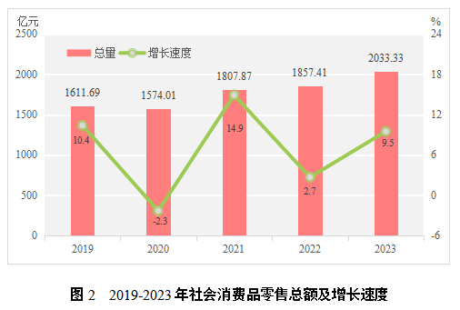 全年全市实现社会消费品零售总额2033.33亿元,比上年增长9.5%。按经营地分,城镇消费品零售额1754.93亿元,增长9.4%;乡村消费品零售额278.40亿元,增长9.9%。按消费形态分,商品零售额1715.49亿元,增长8.1%;餐饮消费额317.84亿元,增长17.5%。