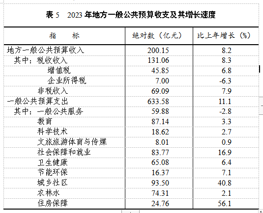 全年一般公共预算地方收入200.15亿元,比上年增长8.2%,其中:税收收入131.06亿元,增长8.3%。税收收入中,增值税45.85亿元,增长6.8%;企业所得税7.00亿元,下降6.3%。一般公共预算支出633.58亿元,增长11.1%。