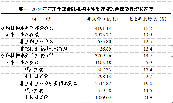 年末全部金融机构本外币各项存款余额4191.13亿元,比上年增长12.2%。其中:住户存款2925.27亿元,增长13.9%;非金融企业存款635.80亿元,增长12.5%;非银行业金融机构存款36.89亿元,增长13.4%。全部金融机构本外币各项贷款余额3709.56亿元,增长14.7%。其中:住户贷款1185.48亿元,增长5.9%;非金融企业及机关团体贷款2514.82亿元,增长19.0%。