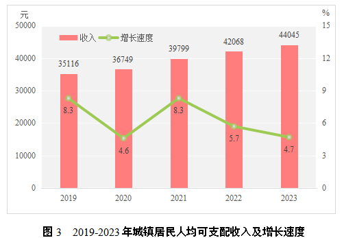 全年居民人均可支配收入35202元,比上年增长5.8%。其中城镇居民人均可支配收入44045元,增长4.7%;农村居民人均可支配收入23178元,增长7.0%。全市居民人均消费支出25657元,比上年增长5.8%。其中城镇居民人均消费支出29451元,增长5.2%;农村居民人均消费支出20498元,增长6.3%。