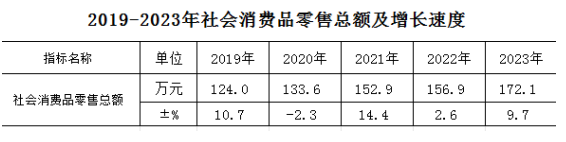全县全年实现社会消费品零售总额172.13亿元,同比增长9.7%。按所在地分:城镇社会消费品零售额同比增长9.7%;乡村社会消费品零售总额同比增长9.9%。按行业分:批发业销售额同比增长8.0%;零售业销售额同比增长8.5%;住宿业同比增长12.6%;餐饮业同比增长17.5%。