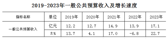 全县一般公共预算收入17.06亿元,同比增长23.0%。一般公共预算地方收入10.20亿元,同比增长8.0%。税收收入14.93亿元,占一般公共预算收入的87.5%。