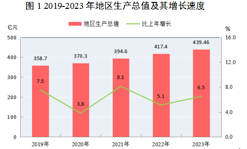 初步核算,全年地区生产总值[2]439.46亿元,比上年增长6.5%。其中,第一产业增加值97.81亿元,增长3.8%;第二产业增加值133.58亿元,增长6.9%;第三产业增加值208.07亿元,增长8.1%。全年人均地区生产总值80532元,增长8.0%。