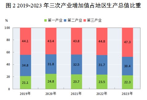 三次产业结构为22.3:30.4:47.3。第一产业占地区生产总值的比重比上年下降1.2个百分点;第二产业占地区生产总值的比重下降1.3个百分点,其中工业增加值占地区生产总值的比重为27.8%,下降0.8个百分点;第三产业占地区生产总值的比重提高2.5个百分点。第一、二、三产业增加值对经济增长的贡献率分别为13.6%、38.2%和48.2%。其中,工业对经济增长的贡献率为41.7%。