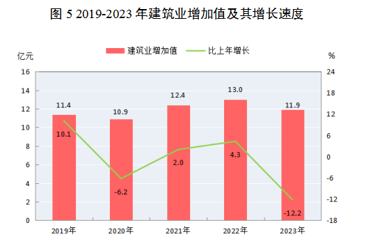 全年建筑业增加值11.9亿元,比上年下降12.2%。全县具有资质等级的总承包和专业承包建筑业企业19家,实现建筑业总产值19.4亿元,增长3.2%。房屋建筑施工面积83.5万平方米,增长2.7%。房屋建筑竣工面积53.1万平方米,下降1.8%。