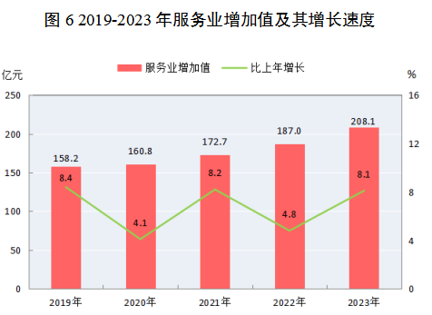 全年批发和零售业增加值28.8亿元,比上年增长12.5%;交通运输、仓储和邮政业增加值20.1亿元,增长4.6%;住宿和餐饮业增加值10.0亿元,增长4.0%;金融业增加值14.1亿元,增长9.6%;房地产业增加值20.3亿元,下降1.3%;信息传输、软件和信息技术服务业增加值23.1亿元,增长37.9%;租赁和商务服务业增加值17.2亿元,增长5.1%;居民服务、修理和其他服务业增加值20.3亿元,增长5.6%。全年规模以上服务业企业营业收入增长25.7%,利润总额增长13.2%。