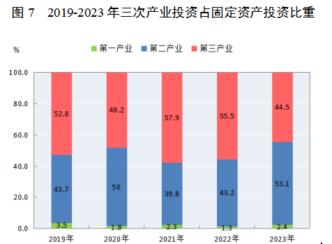 在固定资产投资中,第一产业投资比上年增长35.5%,占固定资产投资的比重为2.4%,比上年提高1.1个百分点;第二产业投资增长1.2%,占固定资产投资的比重为53.1%,提高9.9个百分点;第三产业投资下降24.7%,占固定资产投资的比重为44.5%,下降1个百分点。