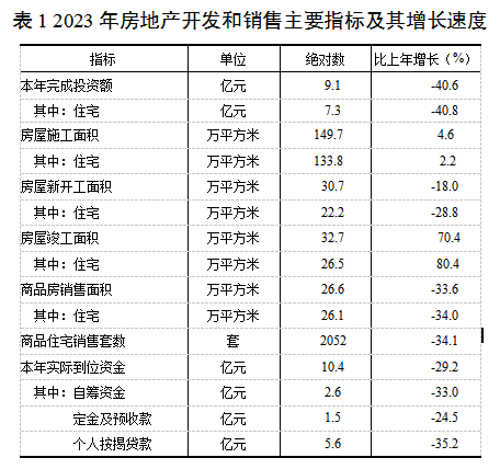 全年房地产开发完成投资9.1亿元,比上年下降40.6%。其中住宅投资额7.3亿元,下降40.8%。商品房销售面积26.6万平方米,下降33.6%。其中住宅销售面积26.1万平方米,下降34.0%。商品房销售额10.6亿元,下降35.3%。其中住宅销售额10.2亿元,下降36.5%。年末商品房待售面积4.0万平方米,比上年末减少4.1万平方米,下降50.0%。
