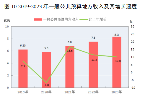 全年一般公共预算收入[9]10.2亿元,比上年增长19.0%。一般公共预算地方收入8.3亿元,增长10.0%。其中,税收收入6.1亿元,增长12.0%;非税收入2.2亿元,增长4.5%。一般公共预算支出55.2亿元,增长10.7%。其中,一般公共服务支出7.0亿元,增长25.0%;教育支出8.4亿元,增长0.4%;社会保障和就业支出10.1亿元,增长13.2%;卫生健康支出6.6亿元,增长0.4%;城乡社区支出2.2亿元,下降4.6%;农林水支出9.7亿元,增长1.5%。