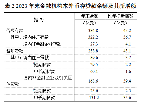 年末金融机构本外币各项存款余额384.8亿元,比年初增加43.2亿元,比上年末增长12.7%。其中,境内住户存款余额322.2亿元,增加36.7亿元,增长12.9%;非金融企业存款余额27.3亿元,增加4.1亿元,增长17.6%。本外币各项贷款余额258.8亿元,增加43.1亿元,增长20.0%。其中,境内住户贷款余额89.6亿元,增加3.7亿元,增长4.4%;非金融企业及机关团体贷款余额168.6亿元,增加39.4亿元,增长30.5%。
