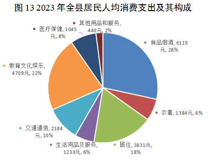 全年全县居民人均消费支出21543元,比上年增长5.1%。城镇居民人均消费支出22200元,增长5.0%。农村居民人均消费支出20970元,增长5.1%。全县居民食品烟酒消费支出占消费总支出的比重(恩格尔系数)为28.4%,比上年降低0.1个百分点,其中城镇为32.2%,农村为24.9%。