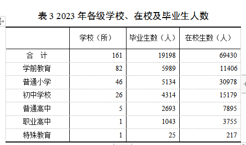 年末全县共有各级各类学校161所。其中,学前教育82所,小学46所,初中26所,高中5所,特殊教育学校1所,职业高中1所。在校学生6.9万人。其中,学前教育在校学生1.1万人,小学在校学生3.1万人,初中在校学生1.5万人,高中在校学生0.8万人,特殊教育在校学生0.02万人,职业高中在校学生0.4万人。小学适龄儿童入学率100%,小学毕业生升学率100%,初中升学率98.15%。教职工人数5488人。其中,学前教育教职工1355人,小学教职工1463人,初中教职工1686人,高中教职工750人,特殊教育教职工23人,职业高中教职工211人。