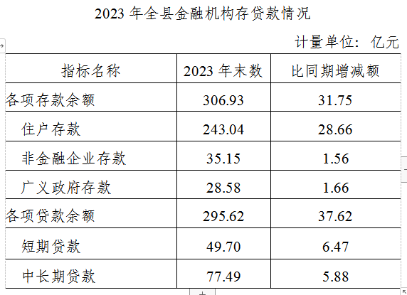 2023年年末,全部金融机构各项存款余额306.93亿元,同比增长11.54%,其中住户存款243.04亿元,同比增长13.37%。全部金融机构各项贷款余额295.62亿元,同比增长14.58%。