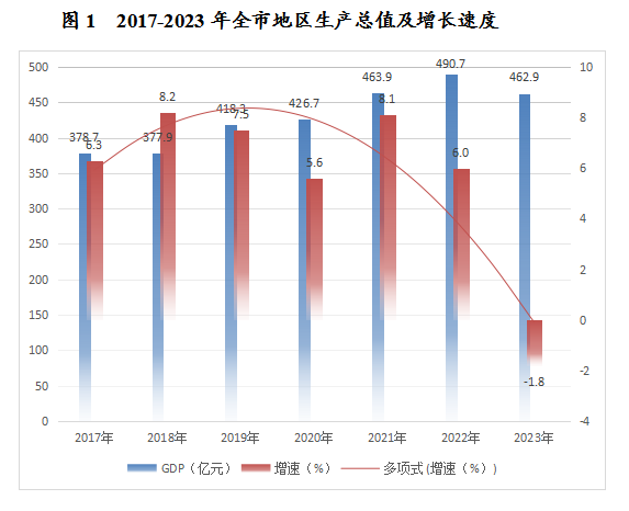 初步核算,全市完成地区生产总值462.9亿元,同比下降1.8%。其中第一产业增加值49.7亿元,增长3.1%;第二产业增加值183.5亿元,下降4.2%;第三产业增加值229.7亿元,增长0.2%。三产业结构比为10.7:39.6:49.7。按常住人口计算,人均GDP达到83409.2元。