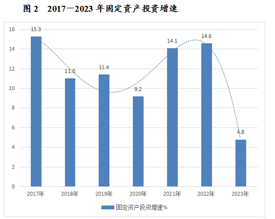 全年固定资产投资增长4.8%;分领域看,工业投资增长2.3%,房地产开发投资增长2.1%。分产业看,产业投资增长20.2%,民间投资增长17.3%。高技术产业投资下降63.1%。