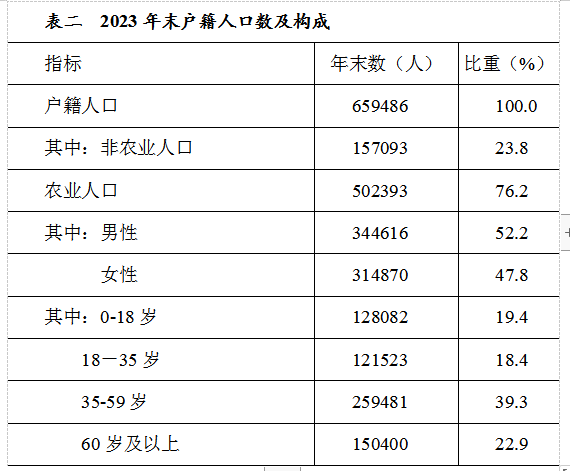 年末全市户籍人口659486人,其中男性344616人,女性314870人。总人口中18岁以下人员128082人,18-35岁人员121523人,35-59岁人员259481人,60岁及以上人员150400人。全年出生3980人,其中男性2123人,女性1857人,出生率为5.8‰。死亡5012人,其中男性2957人,女性2055人,死亡率7.3‰。人口自然增长率- 1.5‰。