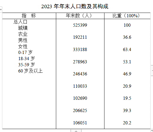 全市总人口525399人,其中城镇人口192211人,农业人口333188人,户籍人口城镇化率36.58%,比上年下降0.11个百分点。全市常住人口42.53万人,其中城镇人口25.31万人,农村人口17.22万人,常住人口城镇化率59.51%。全年出生人口3031人,死亡人口5094人。