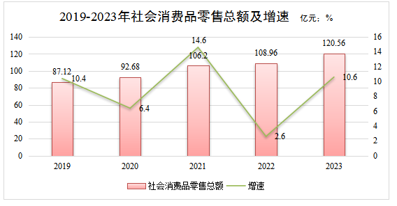 全年全市实现社会消费品零售总额120.57亿元,比上年增长10.6%。按经营地分,城镇消费品零售总额106.21亿元,增长10.5%;乡村消费品零售总额14.36亿元,增长11.75%。